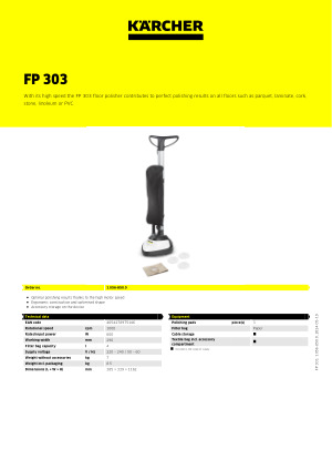 U lepo domaćinstvo spadaju negovani podovi. Ono što je ranije bio komplikovan proces sa mnogo manuelnih radnih koraka, je danas zahvaljujući modernoj opremi prijatno jednostavno. Uređaj za usisavanje i poliranje FP 303 pomoću svog broja obrtaja brine za perfektne rezultate u poliranju na tvrdim podovima kao što su parket, laminat, kamen, pluta, linoleum ili PVC. Nakon deblokade preko nožnog tastera uređaj možete da uključujete i isključujete jednostavno zaokretanjem držalje. Preko funkcije usisavanja se prašina kod poliranja jednostavno usisava. Zahvaljujući optimizovanoj trouglastoj formi glave za poliranje takođe dobro možete da polirate i ćoškove. A ravna glava za poliranje omogućava čak i poliranje ispod nameštaja. Ergonomski rukohvat garantuje jednostavan i rad bez umaranja. Na namotaju za kabl direktno na držalji moguće je jednostavno i čisto odlaganje kabla. Tu je takođe smeštena prvoklasna tekstilna vreća koja sadrži filter vreću od papira. U zasebnoj pregradi za pribor mogu se odlože skidive podloge za poliranje, što štedi prostor. Lakohodni točkovi garantuju uštedu snage i jednostavno transportovanje za FP 303.