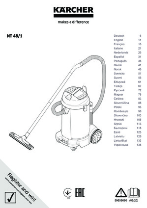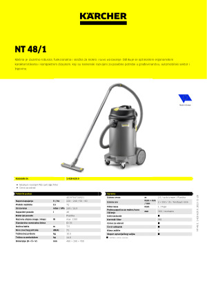 Karcher usisivač NT 48/1 ima zapreminu rezervoara od 48l. Usisivač je opremljen velikim filter uloškom ( 0,8m² ) te omogućava konstantnu veliku snagu usisivanja. Pouzdan sistem plovka omogućava siguran prekid protoka vazduha u slučaju prevelike količine apsorbovane tečnosti. Kroz lako dostupno odvodno crevo možete brzo ispustiti prethodno usisisane velike količine tečnosti. Veliki točkovi se drže na metalnom nosaču i poseduju i kočnice za fiksiranje. Sav pribor se može pričvrstiti i odložiti na zadnjem delu usisivača.