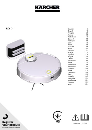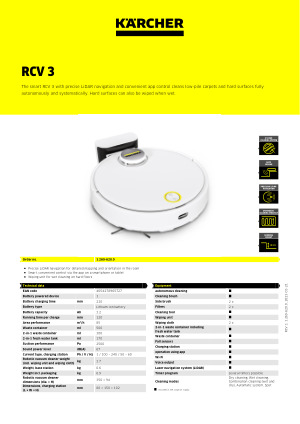 Više vremena za prijatne stvari u životu: Pametni Karcher robot usisivač RCV 3 brine o čišćenju podova. Kada se pokrene, RCV 3 automatski i sistematski čisti tvrde podove i tepihe sa niskom dlakom. Suva prljavština se pouzdano prenosi u ugrađeni kontejner za prljavštinu pomoću rotirajuće četke, bočne četke za ivice i duvaljke. Ako je potrebno, RCV 3 može ne samo da usisava, već i navlaži krpu. Ako kapacitet baterije padne, RCV 3 puni svoju bateriju između i uvek se vraća na svoju stanicu za punjenje nakon obavljenog posla. RCV 3 ide u istraživački obilazak preko kontrole aplikacije i automatski kreira mapu prostorija koristeći detekciju okruženja (LiDAR). Individualni parametri čišćenja se mogu podesiti za svaku prostoriju, na primer gde da se usisava, obriše ili ne čisti. Dodatni senzori sprečavaju pad na stepeništima, na primer. Za čišćenje, RCV 3 se jednostavno pokreće preko aplikacije, koristeći unapred podešen individualni raspored ili pritiskom na dugme na uređaju. Ako je robotu za čišćenje potrebna pomoć, on to u mnogim situacijama saopštava glasom.